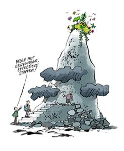 Het laatste dat Mark wil is uit de losse pols met oplossingen strooien, laat staan om met opgeheven vingertje te vertellen hoe het moet. ‘Ik pretendeer niet dat ik het zo goed weet, ook ik zit met vraagtekens. We willen met dit boekje vooral niet fundamentalistisch zijn. Er is geen goed of fout en als je door dit boekje ook maar één stap zet hebben wij ons doel bereikt. Voor mijzelf is het idealisme wel principieel geworden. Sinds die inspiratiesessie kan ik mijn kop niet langer in het zand steken en ga ik all-in als onderdeel van de oplossing. Alles tegen het licht houden, kijken waar ik het probleem kleiner kan maken, hoe ik mijn steentje kan bijdragen. Ik hoop dat ik daarin gesteund word door de mensen om mij heen, maar als zij afhaken ga ik gewoon door. Dat beloof ik hierbij plechtig!’