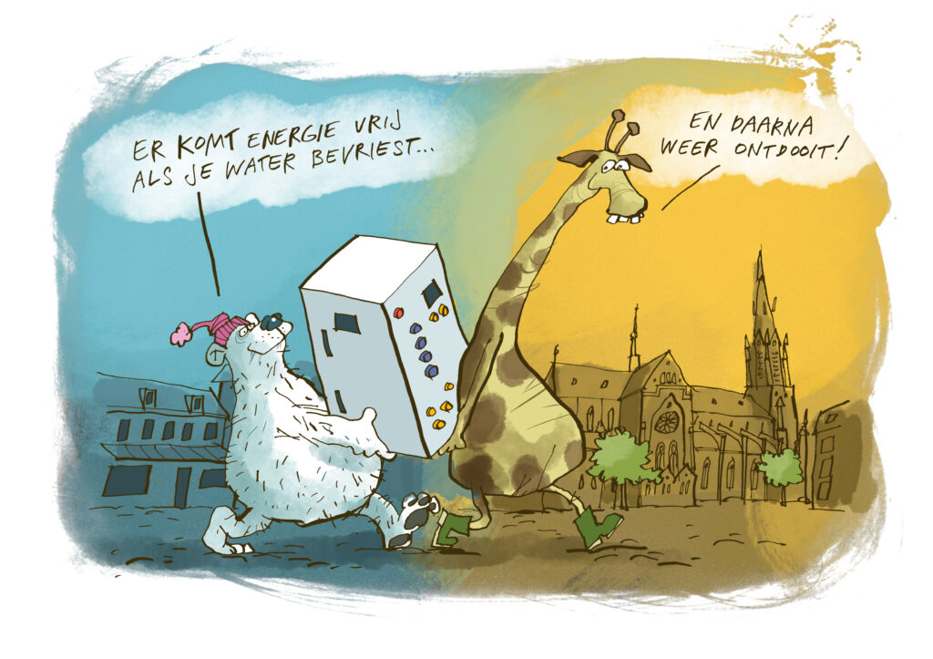 Drie vliegen in één klap: wat is het geheim? ‘Simpele natuurkunde’, zegt Thymen. ‘Helemaal geen hightech, eerder lowtech: geniaal in z’n eenvoud. Bij ons gaan warmte en elektriciteit hand in hand, ze vormen een gelukkig huwelijk. Ons systeem opereert tussen de min 10 en plus 20 graden. Door water te bevriezen en vervolgens te ontdooien komt er exponentieel veel energie vrij, genoeg om water 18 graden te verwarmen. Dat wij door de vorstgrens gaan: daar zit onze kracht. Dit spelletje van energieopslag met bevriezen en ontdooien spelen wij continu. Zo bereik je een superhoog aandeel in hernieuwbare energie, tegen lage kosten en 100 procent duurzaam. Centrale hoog- en middentemperatuurwarmtenetten halen hun energie vaak van gascentrales of afvalverbranding. Dat is zeker niet volledig duurzaam en brengt bovendien veel energieverlies met zich mee voordat de warmte de woning bereikt. Dit resulteert vaak in hogere energiekosten voor bewoners. Ons systeem is daarentegen decentraal, opereert op lage temperaturen en is uiterst energie-efficiënt, met een hoofdrol voor onze grondbuffer.’